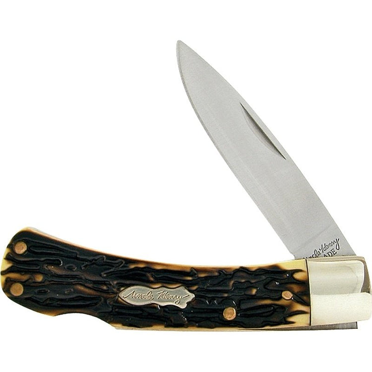 Staglon handle with stainless steel locking blade. Includes nylon sheath.