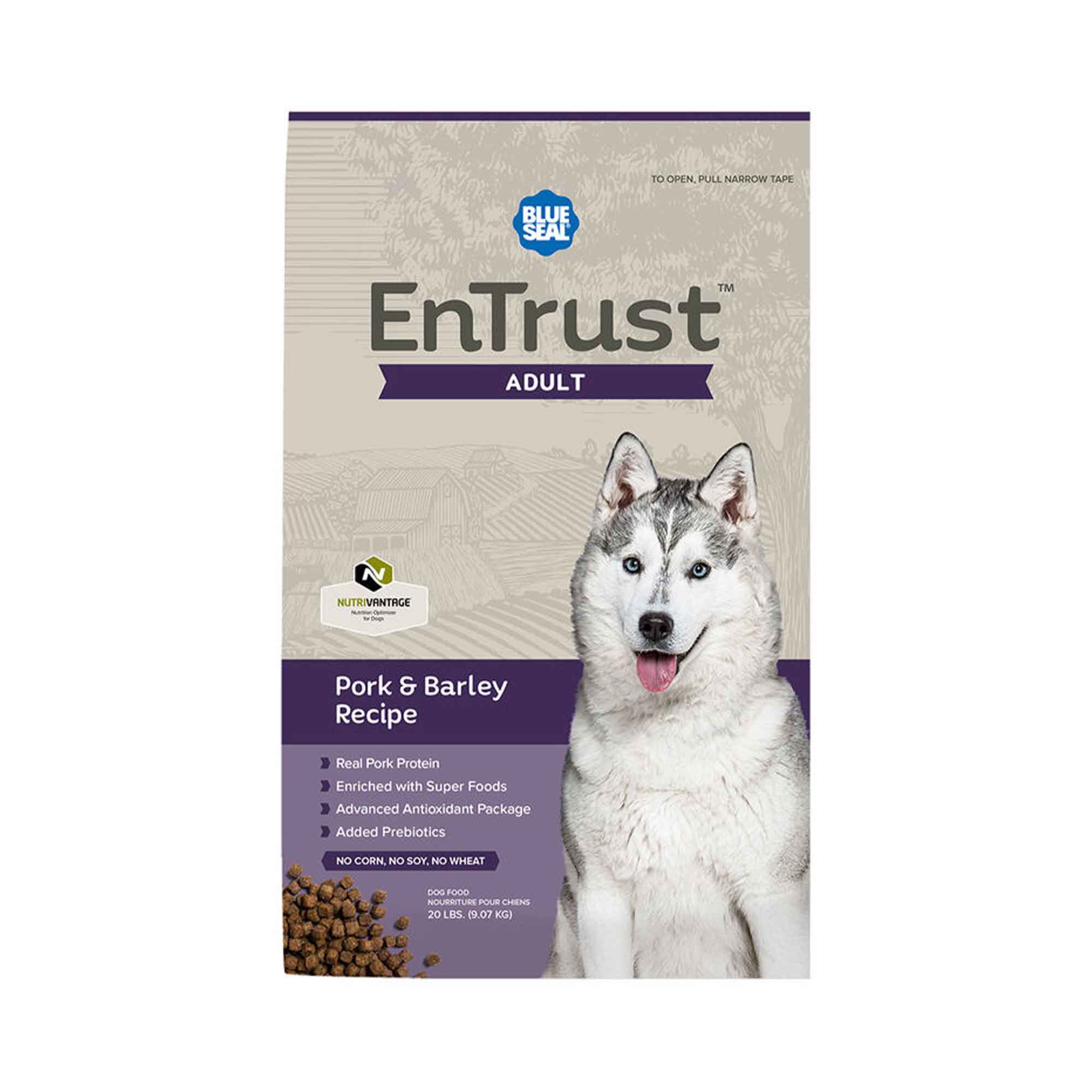 EnTrust Adult Pork Meal & Barley Recipe offers complete nutrition for dogs of all life stages, particularly those with food sensitivities. It's free from corn, wheat, and soy.