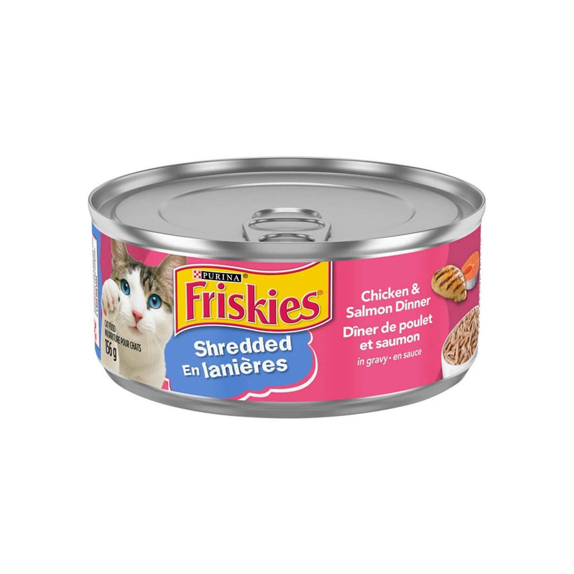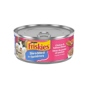 Friskies - Chicken and Salmon Dinner - 156 g combines two of the most popular protein sources for cats: chicken and salmon. Thin strips in a flavorful sauce offer a range of textures and flavors.