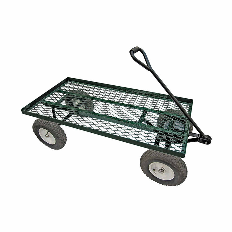 This 1200 lb garden cart is constructed with heavy gauge steel for added strength. Its green powder coating ensures a rust-resistant finish. With 13" pneumatic wheels and a load capacity of 1200 lbs, it is ideal for transporting heavy objects. The 31" x 7/8" diameter steel pull handle ensures easy and comfortable grip. The 24" x 48" mesh body provides a large surface area to load your items.