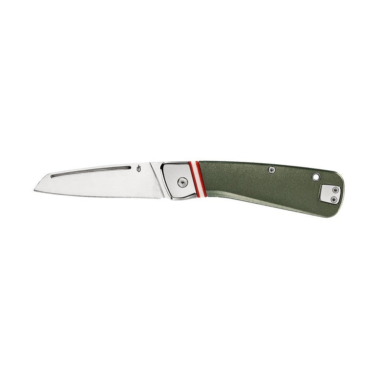 Gerber folding pocket knife, 1 blade, "sheep's foot" style, straight edge, stainless steel, blade length: 7.4 cm, aluminum handle, handle color: green, locking mechanism: slip joint, closed length: 10.2 cm, overall length: 17.5 cm, pocket clip included