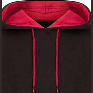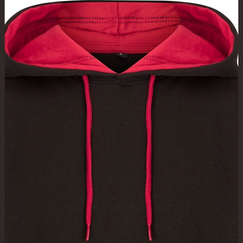 - Contrasting red lining at the hood Adjustable hood drawstring, kangaroo pockets