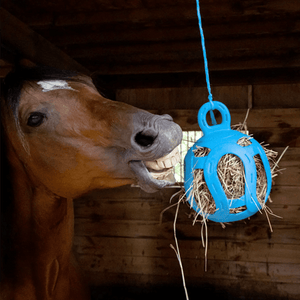 This is a great way to extend feeding time and give your horse something to think about while they maneuver the ball to get more hay or treats. The Horsemen's Pride Jolly Hay Ball is available in green or blue.