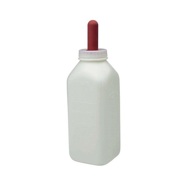 The nipple is made with a special rubber formula to extend the life of the nipple and improve suppleness. Threaded top for a secure fit. The bottle measures 4.25 inches square by 10 inches high and holds 2 quarts. The nipple measures 1 inch in diameter and 3 inches long.