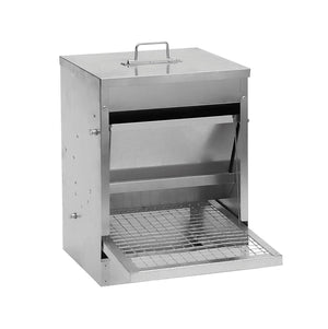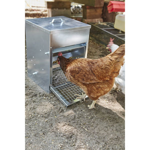 Clever design enables birds to step on the panel to gain access to the feed. Door closes automatically after the birds are done feeding to keep critters out and prevent feed waste. Made of heavy-duty galvanized steel. Holds up to 22 lbs. of feed. Recommended for adult birds