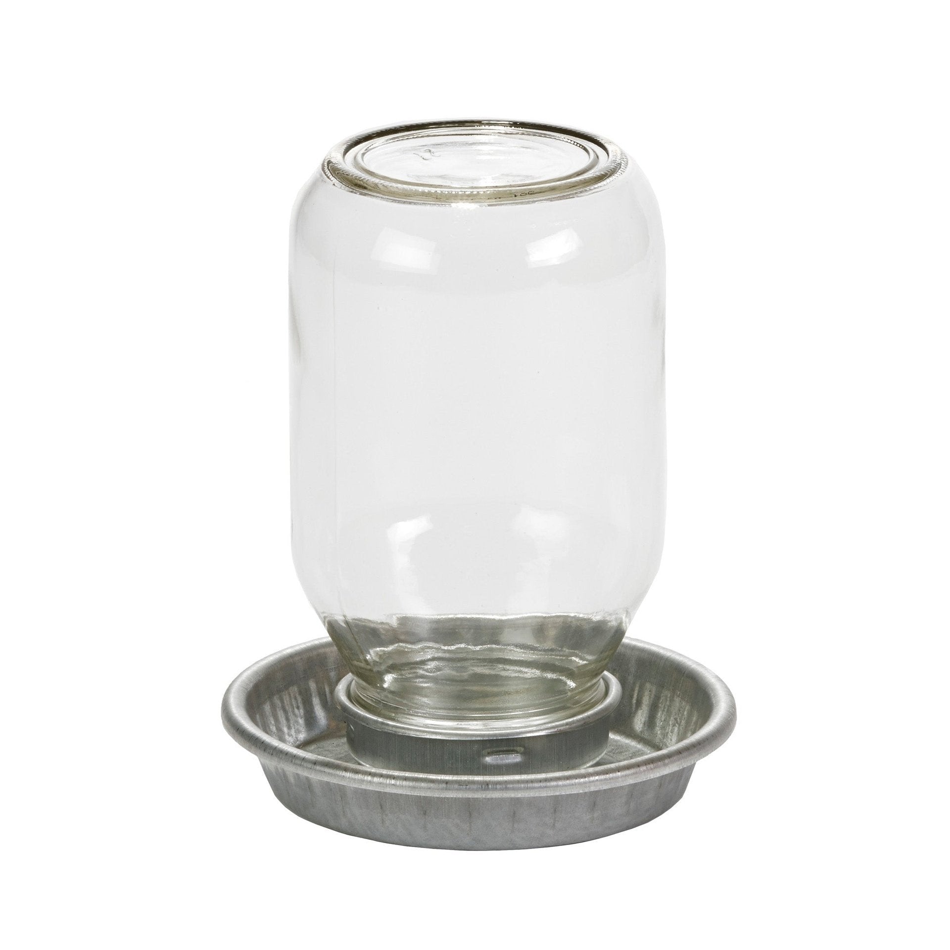 This gravity chick waterer comes fully assembled and includes a glass mason jar. Easy to fill and clean, it holds 1 liter of water. The base is made of sturdy galvanized steel with raised rounded edges to help reduce friction on the chick's neck and head.