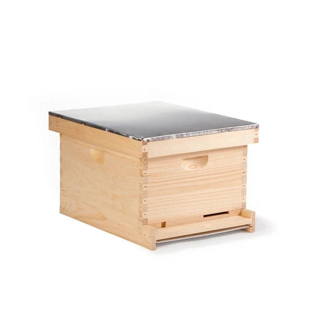 - Standard 10-frame Langstroth hive, made of rough pine, with precision-machined interlocking joints for maximum strength.