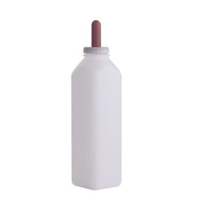 The nipple is made with a special rubber formula to extend the life of the nipple and improve suppleness. Threaded top for a secure fit. The bottle measures 4.1 inches square by 14 inches high and holds 3 quarts. The nipple measures 1 inch in diameter and 3 inches long.