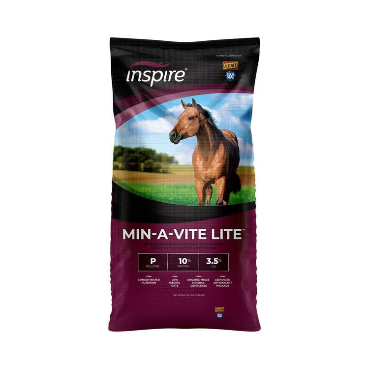 Inspire® Min-A-Vite Lite™ is a mineral and vitamin supplement designed to balance nutritional deficiencies in hay and pasture grass or grass/legume mixes for horses of all ages, weights, classifications and performance levels. It contains all the minerals and vitamins necessary for normal metabolism, growth, performance, reproduction and health. Adding fiber and other low-carb ingredients provides a safe and natural way to supplement a horse's diet. Inspire Min-A-Vite Lite is an ideal feed for horses requiring little or no grain ration without fear of additional weight gain. It can also be fed as a supplement to any Blue Seal equine grain ration to provide additional minerals and vitamins as needed.
