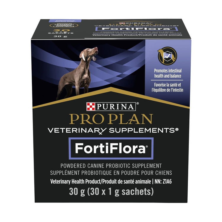 Provide specialized support to your dog by introducing Purina Pro Plan Veterinary Supplements FortiFlora Canine Probiotic Supplement into their diet. This FortiFlora supplement contains a probiotic strain proven to support gut health and balance. Formulated for the dietary management of dogs suffering from diarrhea, this safe and effective probiotic powder supplement is simple to administer by adding it to your dog's regular food. Each sachet of this supplement contains a guaranteed level of live microorganisms that help promote beneficial intestinal microflora. A proprietary microencapsulation process helps improve the stability and survival of probiotics until they reach your dog's gut. This probiotic supplement contains antioxidants and also provides immune support for dogs. This gentle digestive probiotic for dogs also helps reduce gas. FortiFlora probiotics for dogs are suitable for administration to both puppies and adult dogs.