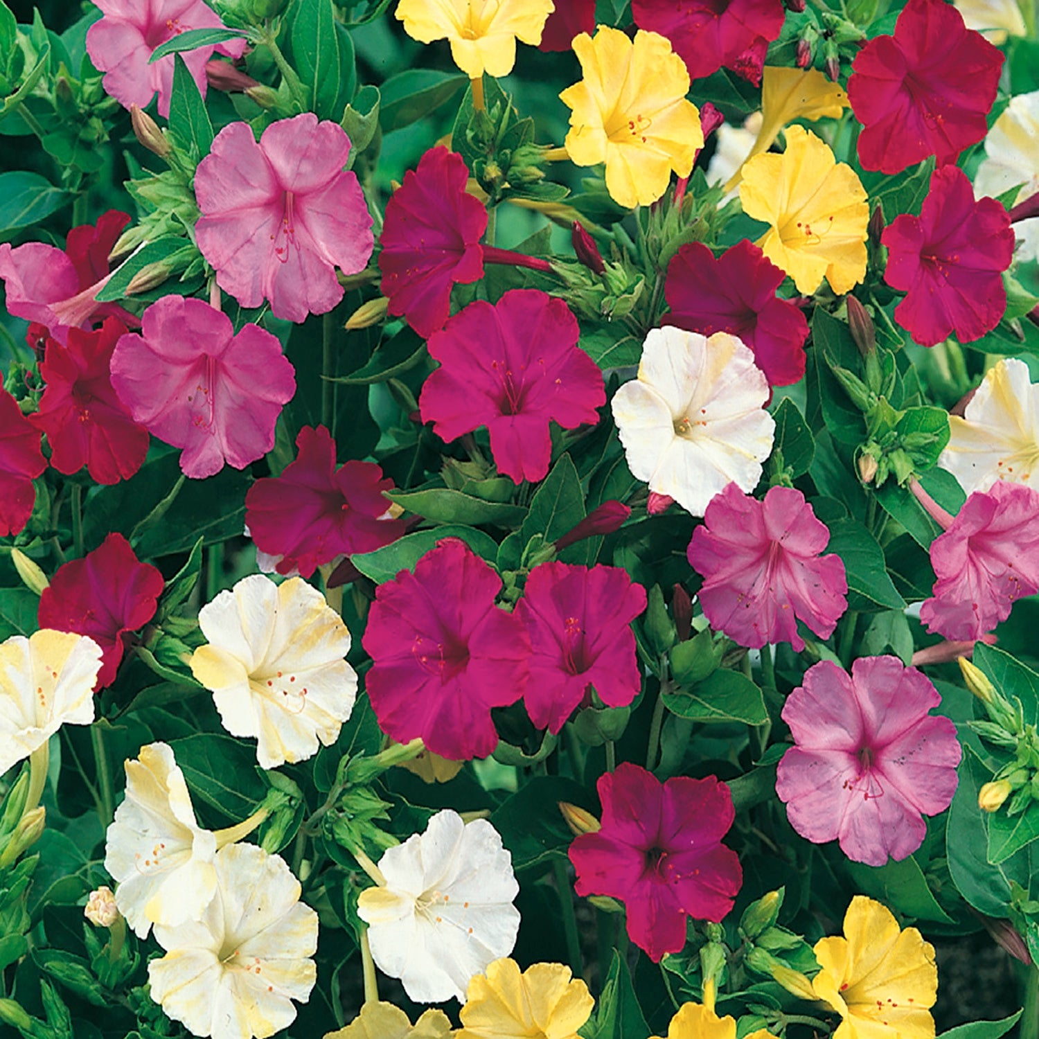 Four O'Clock Mix produces fragrant 5 cm (2) trumpet-shaped flowers that open in the late afternoon. Blooms in great varieties of red, yellow, crimson, white, and pink. Many flowers are mottled, striped, veined or speckled in contrasting colors. Hummingbirds love these flowers. They are also tolerant of poor soil and heat. Plant Type: Annual