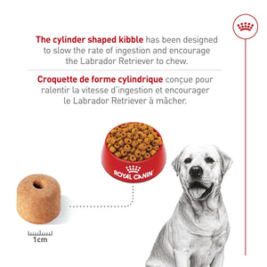 CRISPY KIBBLE: Specialized doughnut-shaped kibble designed for the Labrador Retriever's fast-eating habits.