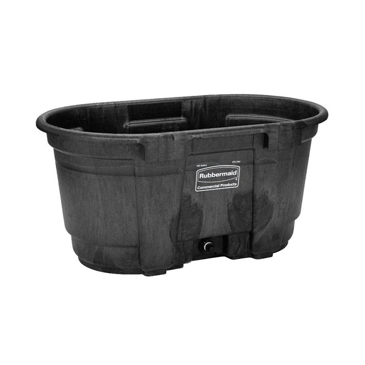 The Rubbermaid 100 Gallon Waterer has a sleek appearance and a smooth black color that features an oversized drain plug for easy draining and cleaning. Constructed from molded polyethylene for superior performance and long-lasting durability in all types of weather. Traditionally used to provide drinking water to farm animals.
