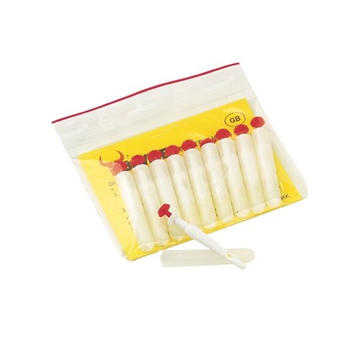 Individually packaged in a plastic tube with petroleum jelly, with a red stopper to be removed during milking. For cows with damaged teats, the drain can be inserted for an extended period.
