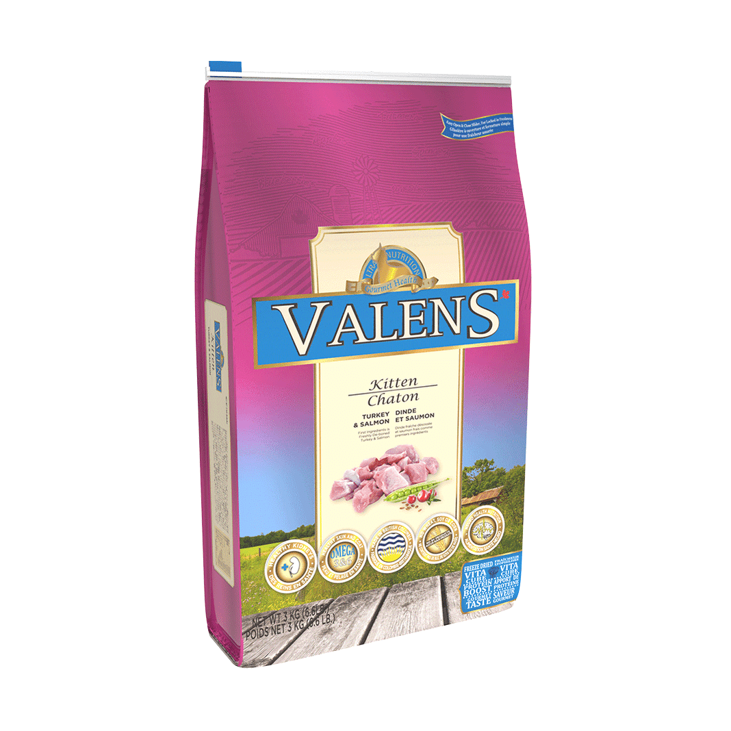 Valens™ Kitten is specially formulated for this important early growth stage in every cat's life. Combining our savory Valley Farms turkey with nutrient-rich salmon fresh from the Pacific Ocean, complemented by tangy fruits and vegetables, this is a recipe they'll never want to be without.