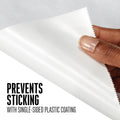 The paper has a plastic coating on one side that prevents sticking and seals in juices. Because the paper does not stick to food during thawing and freezing, the packages are easier to unwrap.