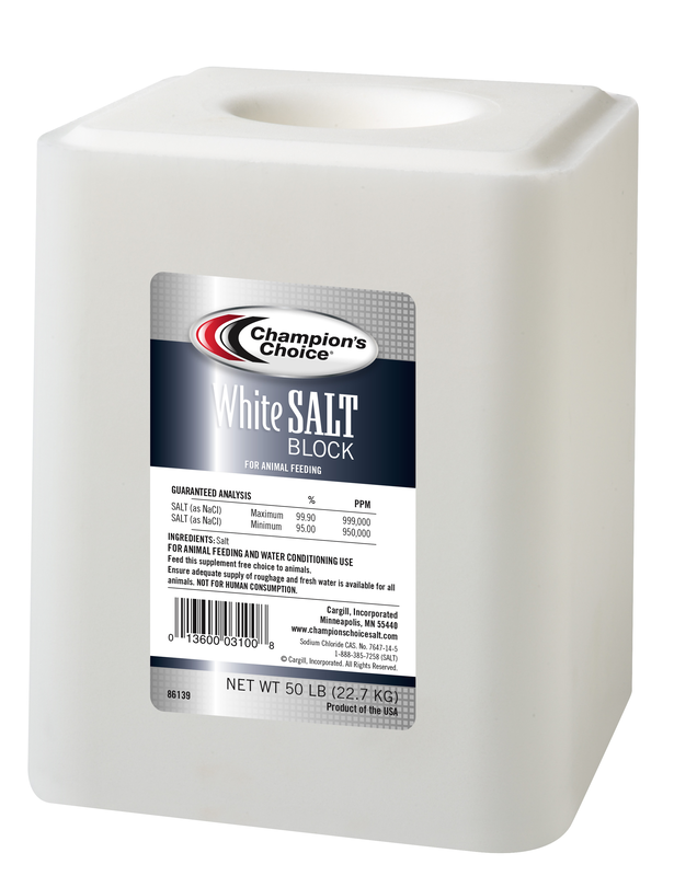 Champion's Choice White salt blocks for livestock are extremely weather resistant and are designed for free feeding.