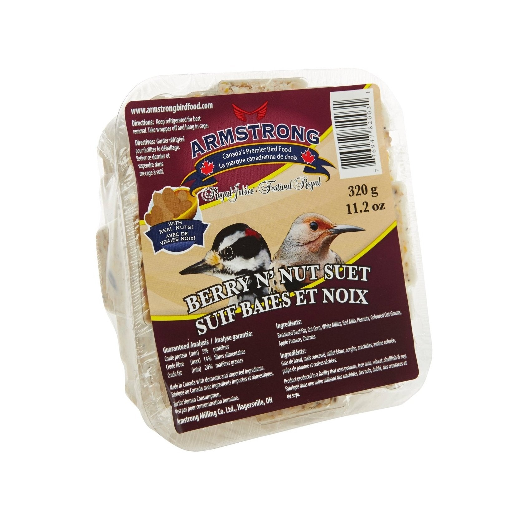Découvrez le Suet aux Baies et Noix Armstrong de 300 g! Une concoction nutritive de saindoux de bœuf, de grains, de graines, de fruits et de noix pour ravir les oiseaux amateurs de fruits et de noix. Parfait pour les mois froids, ce mets délicieux attire une grande variété d'oiseaux. À servir idéalement dans une cage à suif en fil métallique ou un mangeoire avec des cages à suif intégrées. Ne manquez pas ce festin pour attirer des espèces comme les Cardinalis, les Gros-becs à poitrine rose, les Geais bleus et de Steller, les Mésanges à tête noire, les Pic mineur, Pic chevelu et Pic à ventre roux, les Junco ardoisé, les Sittelles à poitrine blanche et à poitrine rousse, et les Pic flamboyant. Offrez-leur le meilleur avec le Suet aux Baies et Noix Armstrong!