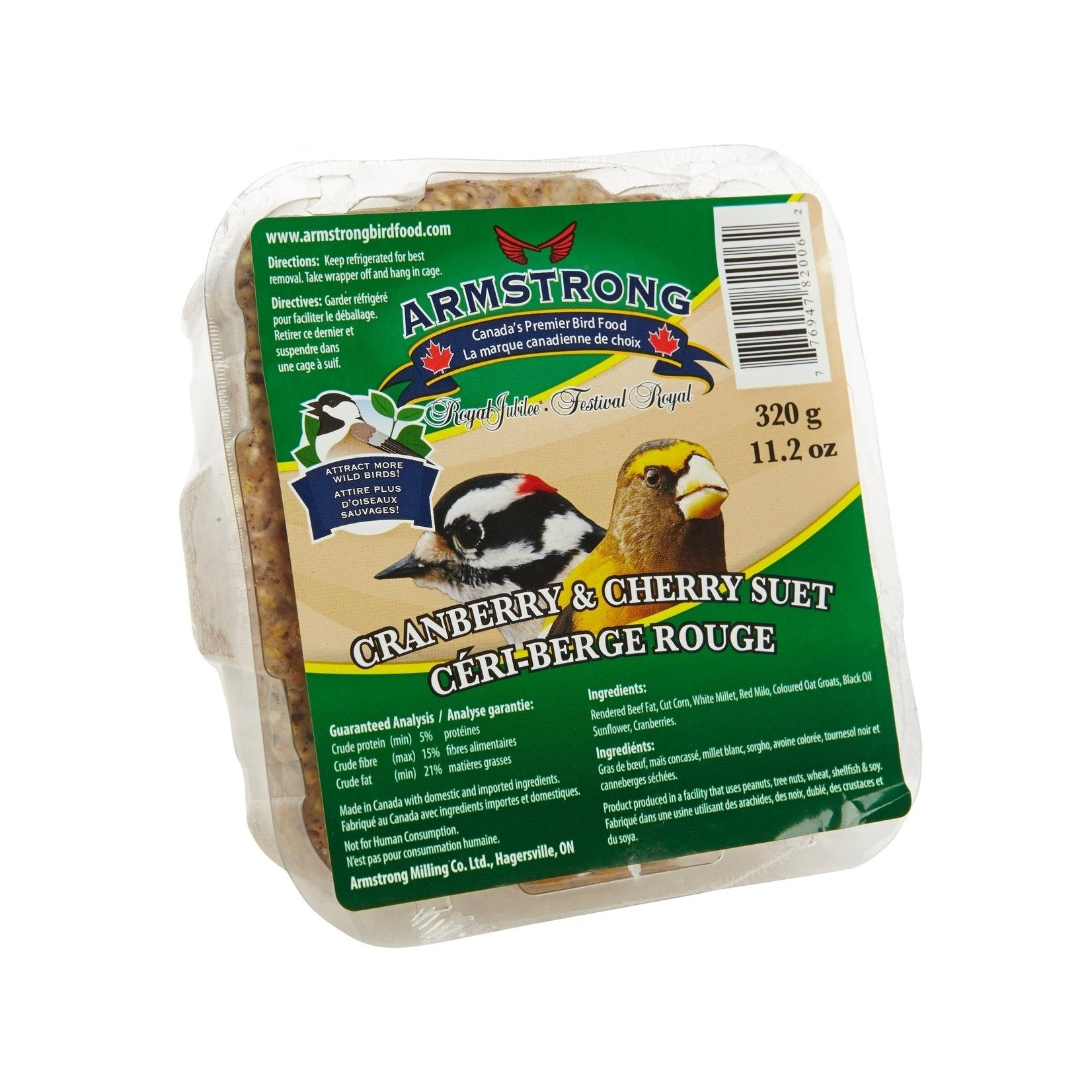 Ravissez les oiseaux sauvages avec le Saindoux Canneberge et Cerise Armstrong 320g. Préparé à base de suif de bœuf et mélangé à des céréales, des graines et des fruits séchés, ce saindoux est une vraie gâterie pour les oiseaux friands de fruits, surtout pendant les mois plus froids. Enrichi de canneberges séchées pour un attrait supplémentaire, ce mélange offre une nutrition complète. Parfait pour nourrir nos amis à plumes pendant l'hiver québécois. Attire pic mineur, pic chevelu, pic à ventre roux, divers autres oiseaux.