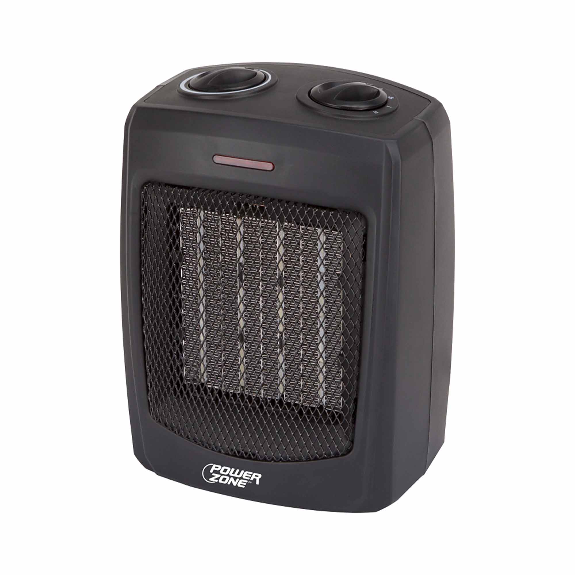 Chauffage électrique portable PowerZone, 120 V, 12.5 A, Puissance nominale : 1500 W, Nombre de réglages de chaleur : 2, Capacité de chauffage : 1500W, Technologie de chauffage : PTC, Longueur du cordon : 72 po, Plastique, Noir, Dimensions : 8-1/4 H x 6 L x 4-5/8 P po