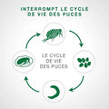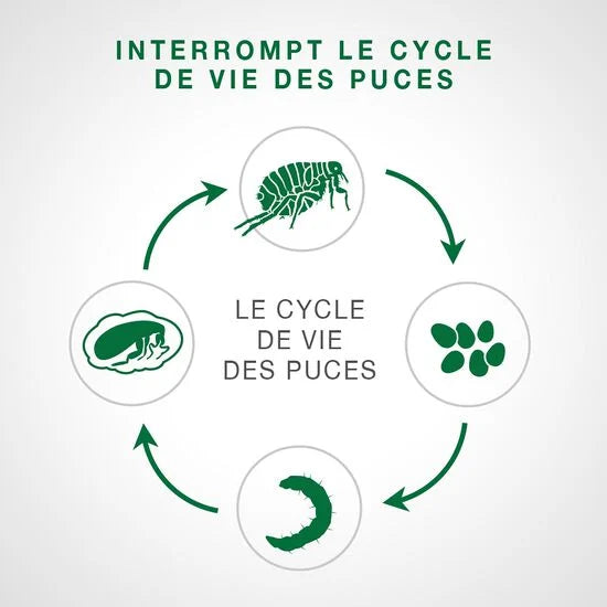 Élimine les puces adultes, larves et œufs sans qu'aucune morsure ne soit nécessaire — action dès le premier contact