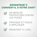 Advantage II d'Elanco est le traitement topique mensuel de référence pour protéger chats et chatons contre les puces. Appliqué directement sur la peau, entre les omoplates, ce traitement en spot-on élimine les puces adultes, les larves et les œufs en un seul passage, brisant le cycle d'infestation à la source sans que votre animal n'ait à souffrir d'une seule morsure.