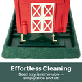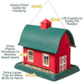 La grande mangeoire « Grange Rouge » fait partie de la vaste collection Village. Son design évoque une grange rouge traditionnelle, agrémentée de touches de blanc et d'un toit vert. Mesurant 26 x 37 x 34 cm (hauteur), cette mangeoire peut contenir jusqu'à 3,6 kg de graines.