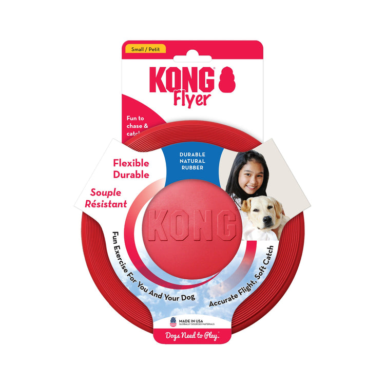 Le KONG Classic Flyer est conçu pour être rapporté. Il est fabriqué en caoutchouc KONG Classic durable qui permet une prise en main indulgente, et le matériau offre un rebond dynamique au cas où votre chien raterait le lancer initial.