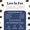 Foie de canard, canard, glycérine végétale, protéine de chanvre en poudre, patate douce, huile de chanvre, bourgeon Phytozen (huile essentielle d'orange et polyphénols naturels), farine de sarrasin, Reishi [10 :1], Ashwagandha biologique, mélasse, lécithine de tournesol, varech, L-théanine, extrait de camomille, Yucca Schidigera, graines de citrouille, myrtilles, baies de Goji, racine de gingembre, poudre de curcuma, extrait de romarin.