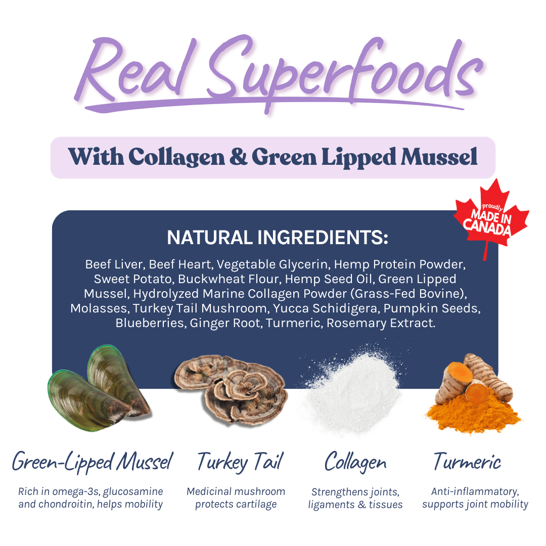 Aide la mobilité de votre chien avec des superaliments comme la moule verte, le collagène et le curcuma.