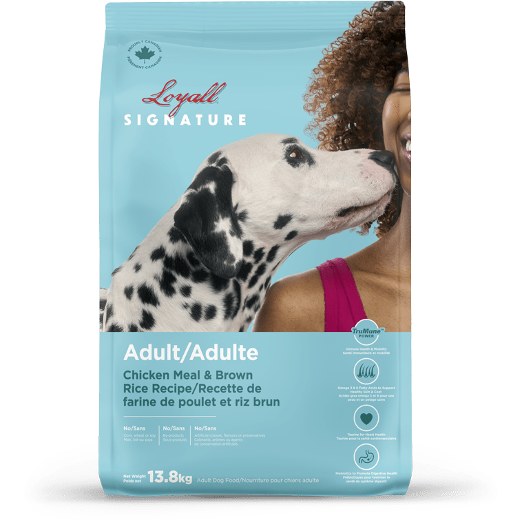 Découvrez la joie de votre chien heureux et en bonne santé, qui se sent aimé et soigné chaque jour, grâce à Loyall® Signature Adulte – Recette de farine de poulet et de riz brun. Notre recette élaborée contient des protéines de poulet comme premier ingrédient pour une alimentation à base de protéines de haute qualité, ainsi qu’une variété de fruits et de légumes.