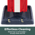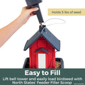 Ses fenêtres, encadrées de vitres en plastique transparent, permettent de contrôler facilement le niveau de graines. Le toit est équipé d'un clocheton amovible pour un remplissage aisé. Le grand plateau/perchoir est amovible pour un nettoyage facile.