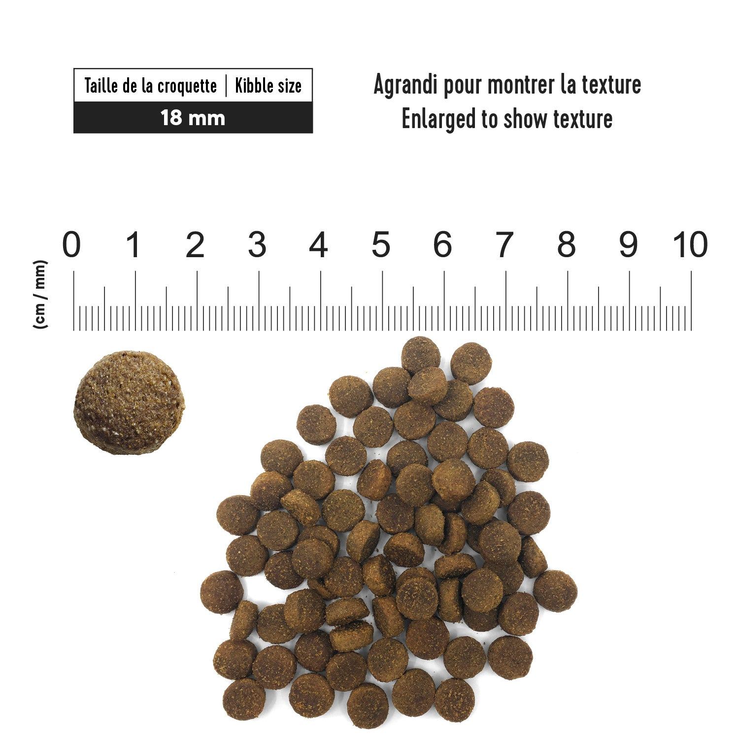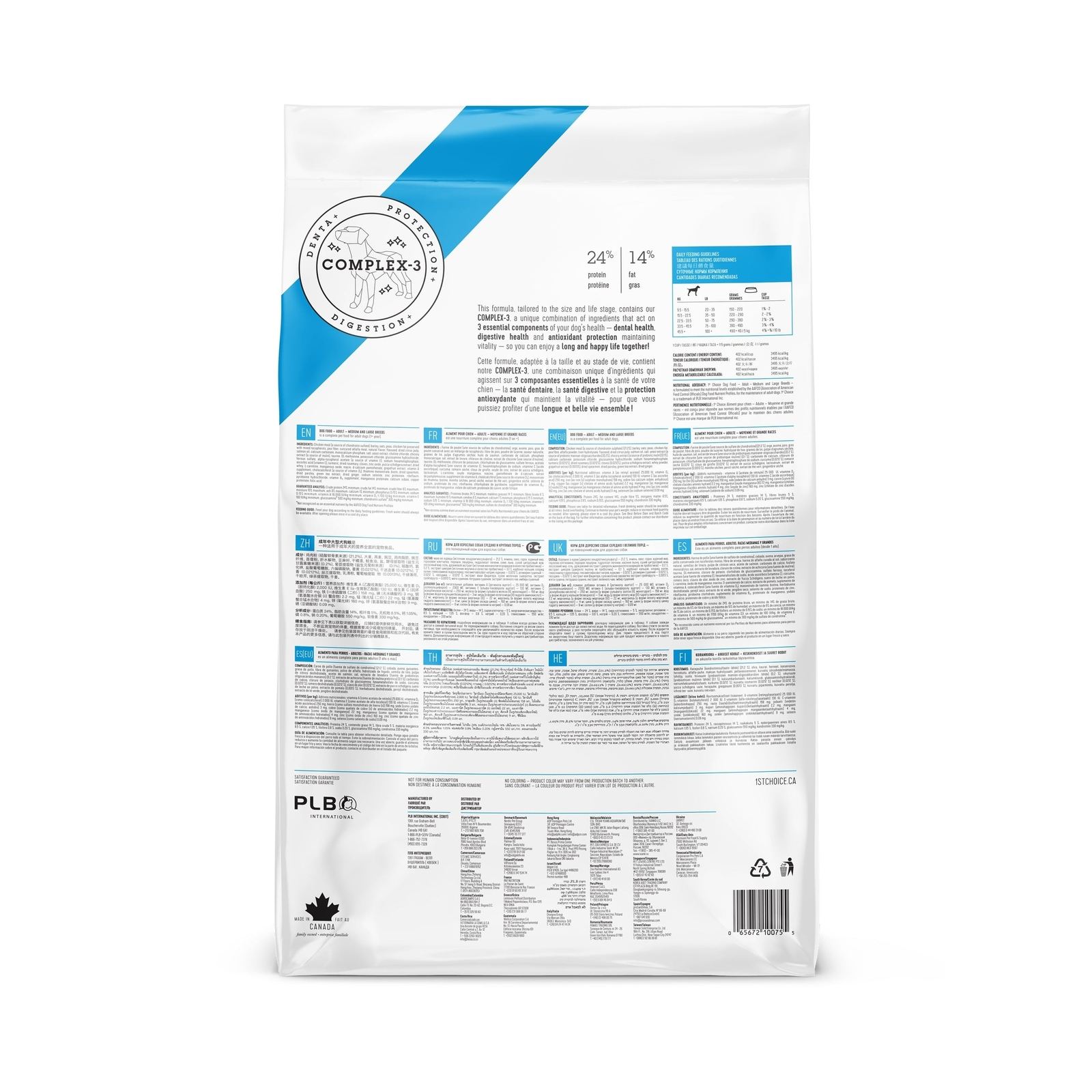 Cette nourriture au poulet est complète et équilibrée afin de répondre aux besoins spécifiques des CHIENS ADULTES de moyennes et grandes races. Puisque ces derniers sont plus susceptibles de développer des problèmes articulaires, nous avons ajouté de la glucosamine et de la chondroïtine pour protéger le cartilage et les articulations. Grâce aux fibres prébiotiques, le transit intestinal et la consistance des selles sont optimisés. De plus, un mélange soigneusement choisi d’antioxydants aide à limiter l’inflammation et à ralentir les conséquences du vieillissement précoce ainsi que le déclin cognitif. Offerte durant toute la vie adulte, cette formule constitue une stratégie préventive qui renforce le système immunitaire et favorise la santé globale des chiens !