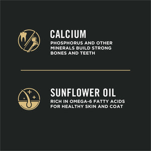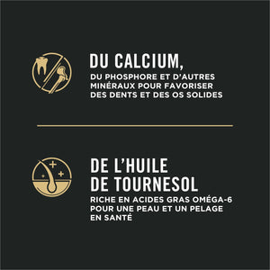Protéines brutes (min.) 28,0 %, Matières grasses brutes (min.) 13,0 %, Fibres brutes (max.) 4,75 %, Humidité (max.) 12,0 %, Acide linoléique (min.) 1,7 %, Acide eicosapentanoïque (EPA) (min.) 0,1 %, Acide docosahexanoïque (DHA) (min.) 0,1 %, Calcium (Ca) (min.) 1,1 %, Phosphore (P) (min.) 0,9 %, Vitamine A (min.) 15 000 U.I./kg, Vitamine E (min.) 100 U.I./kg, Acides gras oméga-6* (min.) 1,8 % *Non reconnu comme élément nutritif essentiel selon les profils d’éléments nutritifs des nourritures pour chiens de l’AAFCO.