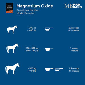 La poudre d’oxyde de magnésium de Mad Barn est un supplément de macrominéral qui favorise une humeur équilibrée, les performances, la fonction musculaire et la santé métabolique chez les chevaux.