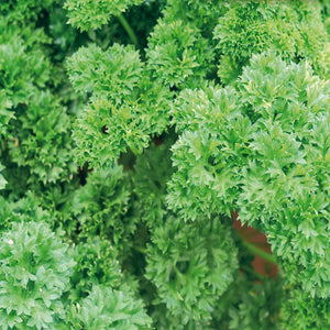 Dense fine foliage, closely curled, very dark green. Excellent for flavoring soups, salads, stews or as a garnish and very good for freezing. Prefers partial shade. Plant Type: Biennial Herb