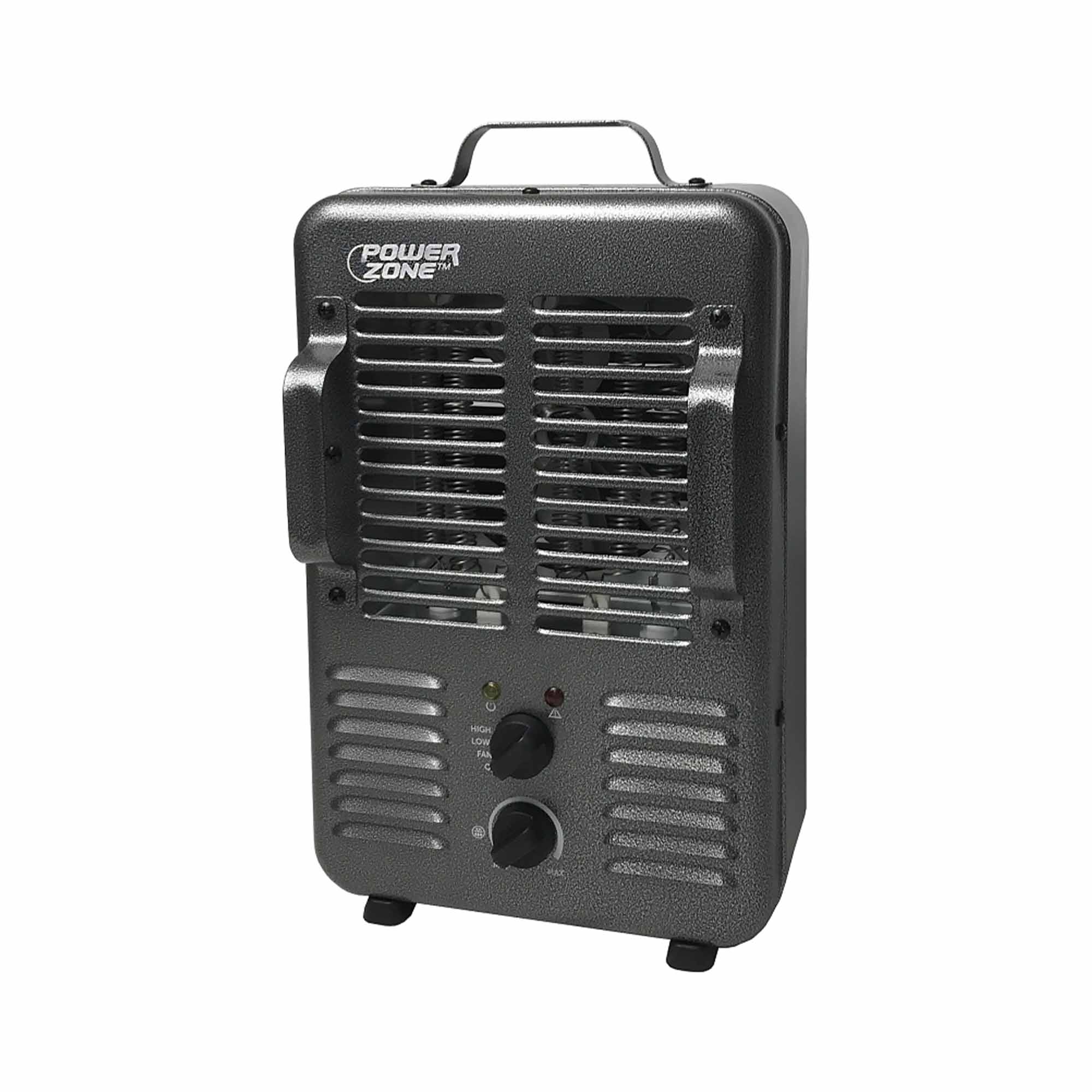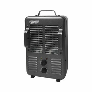 Le chauffage portable PowerZone Deluxe Milk House offre (2) étages de chauffage de 120 V, 12,5 A, 60 Hz, 1300/1500 W, longueur de cordon de 72 po, matériau de boîtier métallique durable, thermostat réglable, interrupteur anti-basculement et protection contre la surchauffe. Convient pour les garages et les ateliers. Taille : 10 po de largeur, 15 po de hauteur, 7 po de profondeur.