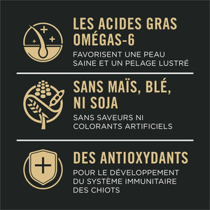 Chaque ingrédient de haute qualité est soigneusement choisi pour un objectif nutritionnel ou fonctionnel spécifique. Nous utilisons de l'huile de tournesol, une riche source d'acides gras oméga-6, et de la vitamine A pour soutenir la peau et le pelage sains de votre chiot. Le DHA, issu d'huile de poisson riche en oméga, alimente le développement de son cerveau et de sa vision.
