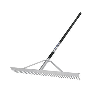 Le râteau de paysagiste en aluminium est conçu avec une tête large de 36 pouces et un manche de 66 pouces.