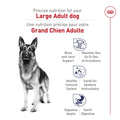 Les croquettes Royal Canin Grand Adulte sont formulées pour les chiens de grande race — de 25 à 45 kg — à partir de 15 mois. La grande taille des croquettes à texture croustillante ralentit l'ingestion et favorise la mastication, un facteur important pour les grandes races. La formule soutient également la santé articulaire, les défenses immunitaires et une digestibilité élevée.