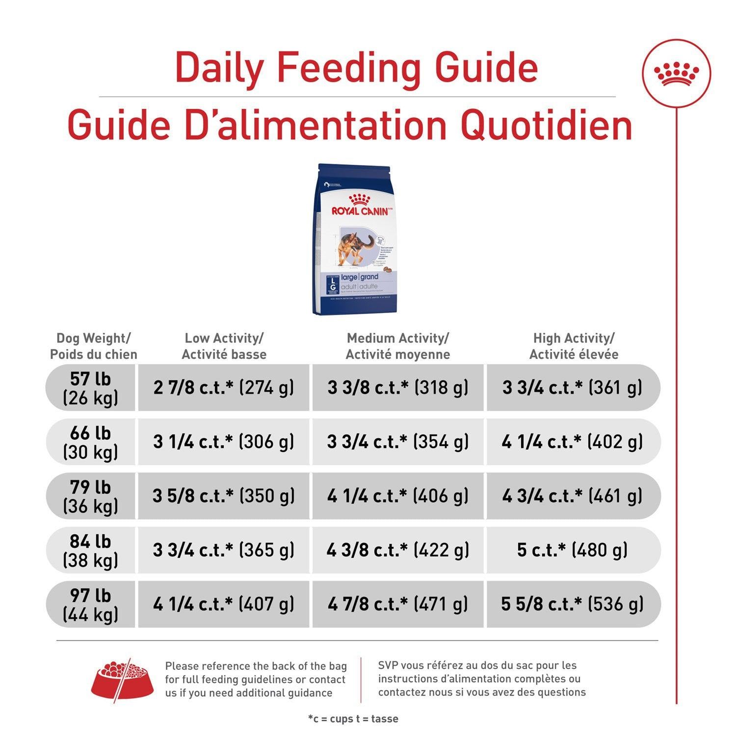 NOURRITURE POUR CHIENS DE GRANDE TAILLE : La nourriture sèche pour chiens Royal Canin Grand Adulte est formulée pour les chiens de grande taille de 15 mois et plus, pesant de 56 à 100 lb.