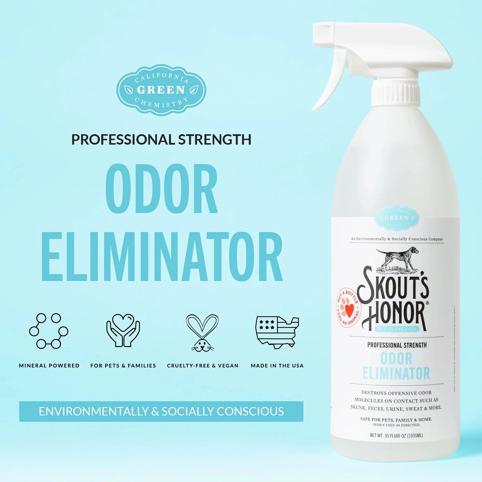 L'éliminateur d'odeurs Skout's Honor utilise une formule probiotique avancée pour neutraliser définitivement les odeurs de votre animal de compagnie — qu'il s'agisse d'odeurs corporelles, de litière ou d'accidents sur les surfaces. Contrairement aux simples désodorisants, ce produit élimine la cause de l'odeur et non seulement ses effets.