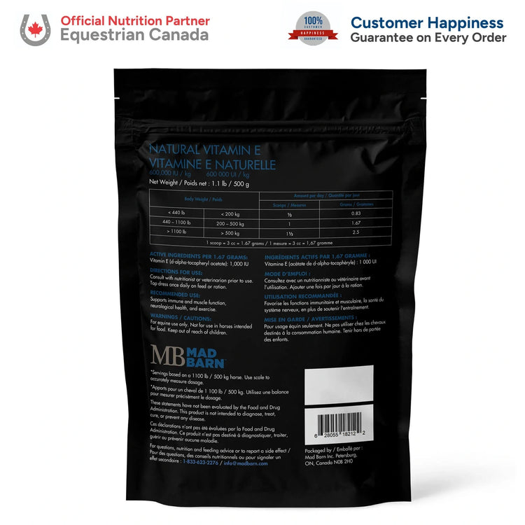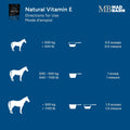 Notre supplément naturel de vitamine E constitue une source hautement biodisponible d’acétate de d-alpha-tocophéryl pur, sans aucun agent de remplissage ajouté. La vitamine E est essentielle pour la fonction immunitaire, la santé musculaire, le soutien du système nerveux et les défenses antioxydantes. Les chevaux nourris au foin ont besoin d’un supplément de vitamine E dans leur alimentation.