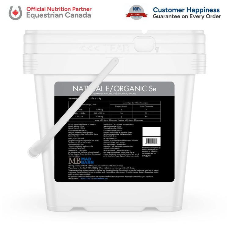 Mad Barn’s Natural E/Organic Se est une source en granulés de vitamine E naturelle et de sélénium organique qui assure un statut antioxydant optimal à votre cheval.