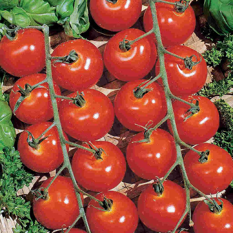 A cherry type tomato that produces 25 g (1 oz) fruit that are 2.5 to 4 cm (1 to 1 1/2") in diameter in clusters of 15 to 20 throughout the summer. The fruits are very sweet - perfect for eating fresh or in salads. If using to make juice or preserves, it is not necessary to add sugar since the fruit has a high sugar content. Plant Type: Vegetable
